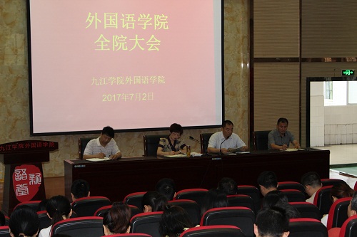 7月2日上午,外国语学院在香远楼三楼学术报告厅召开全院大会,院领导韩琨、杨杰、柴克清、彭晓及全院教职工参加。会议由党委书记杨杰主持。